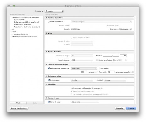 Los metadatos que incluiremos en las fotos que exportaremos y enviaremos por email pueden ser: